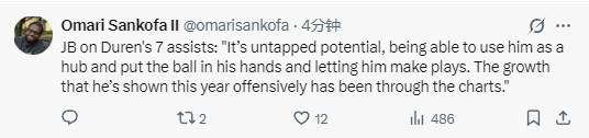 在谈到杜伦送出7次助攻的表现时,比克斯塔夫说道:“这是他尚未完全开发的潜力。我们可以把他作为进攻轴心,把球交给他,让他组织进攻。他今年在进攻端的进步幅度简直超乎想象。”