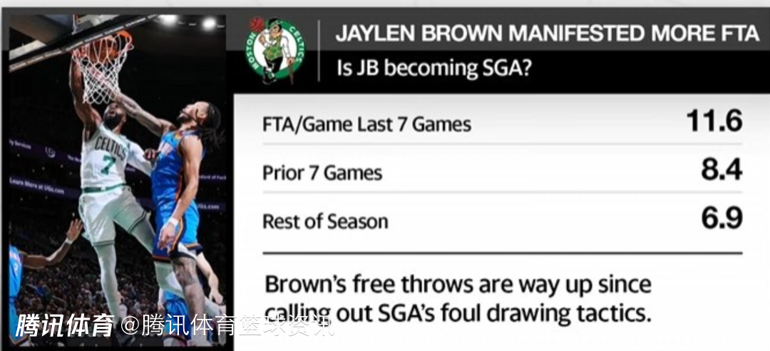 据统计,布朗从吐槽亚历山大罚球起的7场比赛,场均11.6次罚球,而在这之前的7场,他场均8.4罚,赛季场均6.9罚。